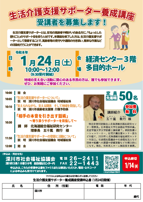 1月24日(土)「生活介護支援サポーター養成講座」のお知らせ